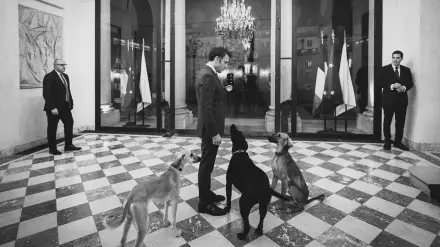 На черно-белом снимке запечатлен Макрон, рядом стоят три собаки - две тазы по кличке Жюль и Жанна и черный лабрадор Немо, которого в 2017 году президентская чета взяла из приюта для животных.