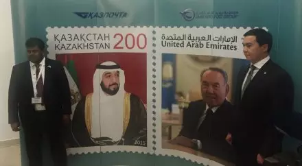 С 28 октября в обращение вводится совместный выпуск почтовых марок, посвященных развитию казахстанско-эмиратских отношений. На них изображены главы государств - Президент РК Нурсултан Назарбаев и президент ОАЭ шейх Халифа бен Заид Аль Нахаян. Номинал почтовых марок составляет 200 тенге, тираж - 10 тысяч штук. Она выполнена художником Куатом Ибрайшиным офсетным способом в четыре краски с гребенчатой перфорацией.