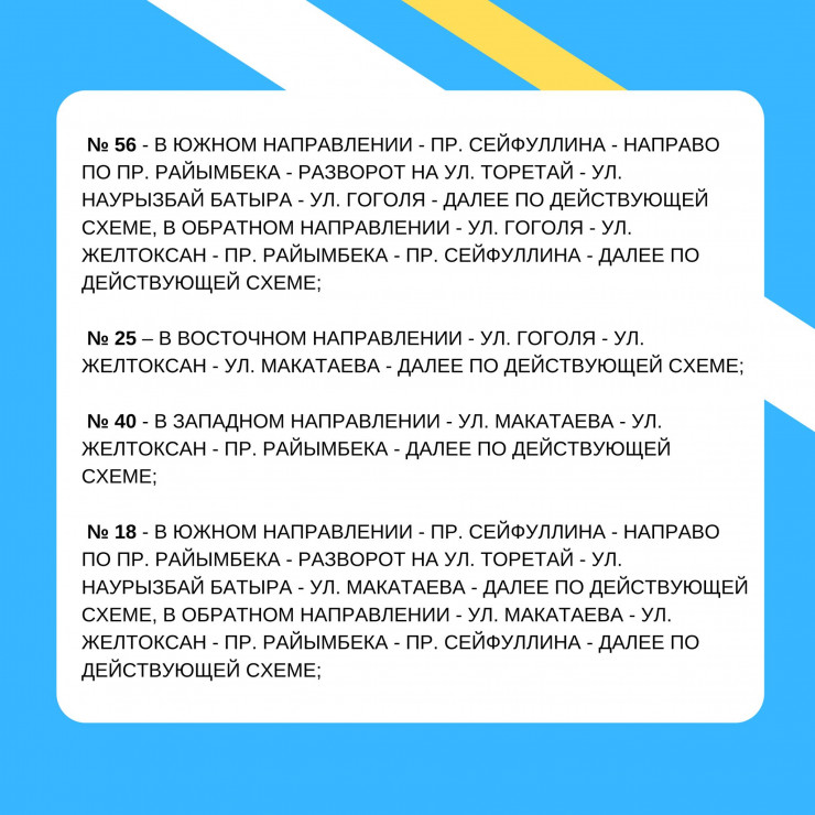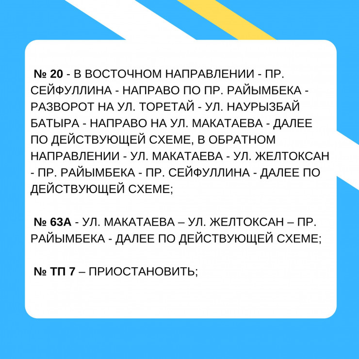 "По проспекту Сейфуллина с 17 по 18 июля в связи проводимыми дорожно-ремонтными работами будет внесено изменение в схемы троллейбусных и автобусных маршрутов. Приносим свои извинения за предоставленные неудобства и просим корректировать свой маршрут заранее", - говорится в сообщении.
