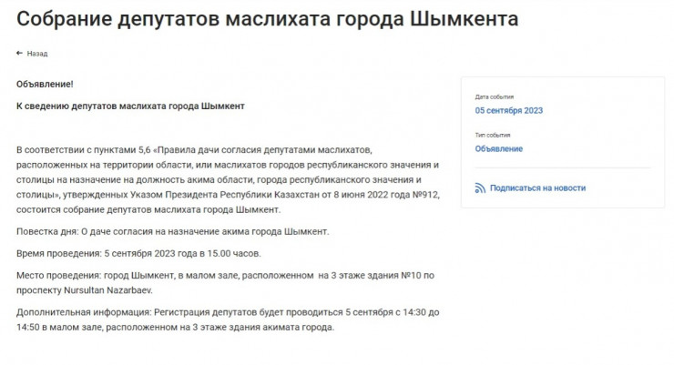 Сообщается, что сегодня, 5 сентября, в 15:00 состоится собрание депутатов. Повестка дня: О даче согласия на назначение акима города Шымкента.