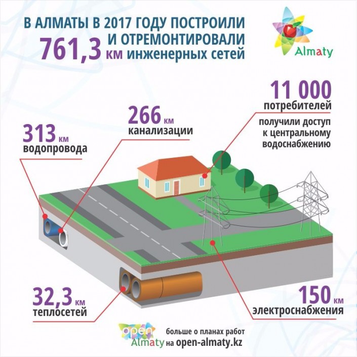"Этим летом в Алматы были проведены масштабные работы по реконструкции и строительству инженерных сетей общей протяженностью 761,3 километра, в том числе 313 километров водопровода и 266 километров канализации, 150 километров сети электроснабжения и 32,3 километра сети теплоснабжения", - привели данные в акимате.