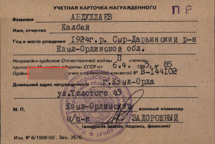 "Орден обнаружили в Павлодаре на чердаке при переезде. Известно, что это награда уроженца Сырдарьинского района Кызылординской области Калбая Абдуллаева 1924 года рождения. До войны он проживал по адресу: улица Толстого, дом 43", - сообщили в пресс-службе общественного объединения Atamnyn Amanaty. В организации показали соответствующий документ на орден.
