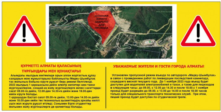 "По автодороге Медеу - Шымбулак установлен пропускной режим въезда. Для пешеходов проход по дороге строго запрещен. При этом, пеший проход доступен по студенческой тропе", - говорится в сообщении.