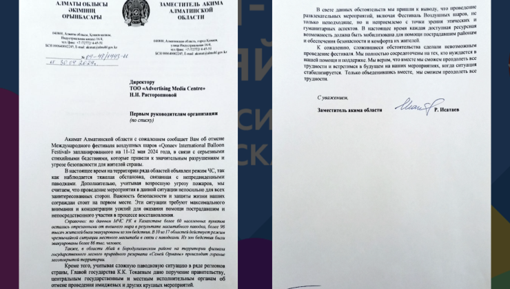 "С сожалением сообщаем вам об отмене Международного фестиваля шаров “Qonaev International Balloon Festival”, который был запланирован на 11-12 мая 2024 года. Фестиваль отменяется в связи с серьезными стихийными бедствиями, которые привели к значительным разрушениям и угрозе безопасности для жителей нашей страны. В свете данных обстоятельств и в знак солидарности с пострадавшими проведение Международного фестиваля воздушных шаров считаем неприемлемым с точки зрения этических и гуманитарных аспектов. Просим вашего понимания в сложившейся ситуации", - сообщили организаторы фестиваля воздушных шаров.