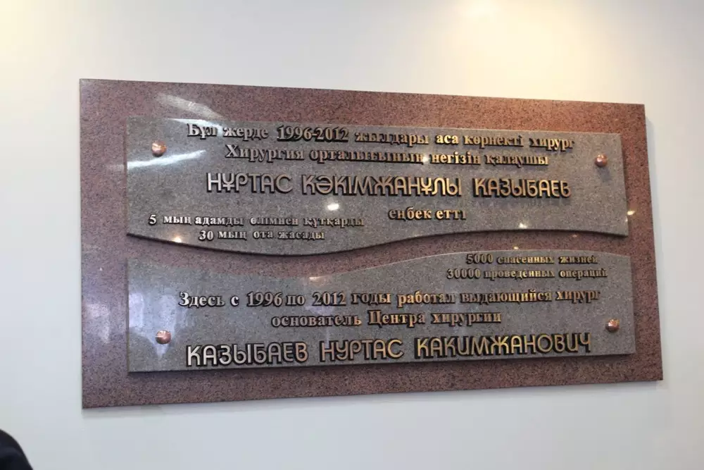 Мемориальную доску известного хирурга Нуртаса Казыбаева открыли в Алматы Мемориальная доска Нуртаса Казыбаева в стенах больницы, где он проработал 16 лет. Фото ©Дмитрий Хегай