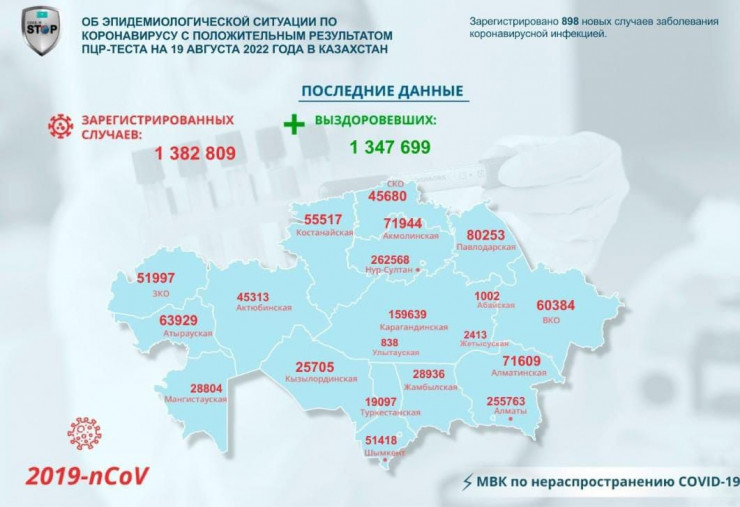 За прошедшие сутки (19 августа) в Казахстане зарегистрировано 898 новых случаев заболевания коронавирусной инфекцией, передает Tengrinews.kz со ссылкой на МВК по нераспространению COVID-19.