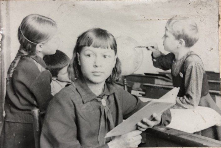 Урок арифметики в меркенской средней школе. На девочке - пионерский галстук и платье с цветочным узором.