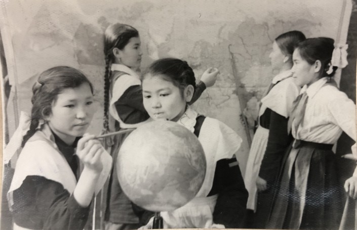 Алма-Ата. 1938 год. Три ученика школы № 12 имени Кирова на перемене. Одна увлечена чтением, две другие заняты изучением глобуса. Школьной формы как таковой нет. Но можно заметить общий стиль в одежде. На девочках однотонные платьица, кофточки на пуговицах, верхняя рубашка.