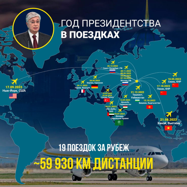 За 19 поездок Касым-Жомарт Токаев налетал около 60 тысяч километров. Это равносильно тому, что он полтора раза облетел Землю по экватору. Также это более месяца в дороге с постоянной сменой часовых поясов и десятки встреч, в ходе которых нужно твердо отстаивать интересы Казахстана.