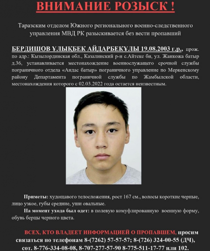 Напомним, что Улыкбек Бердишов был призван в армию в сентябре 2021 года, а 2 марта 2022 года его матери сообщили, что сын пропал. Его приметы: худощавого телосложения, рост 167 сантиметров, волосы короткие черные, лицо узкое, губы средние, уши овальные. На момент ухода был одет в полевую камуфлированную военную форму, обувь - берцы черного цвета.