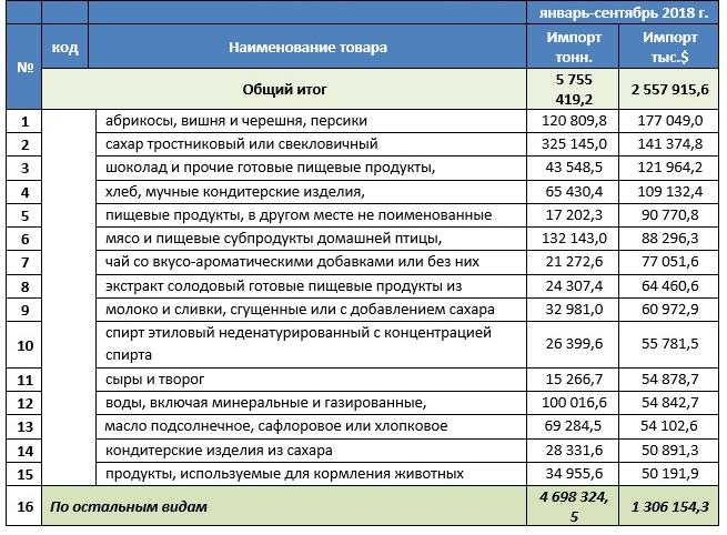 В январе - сентябре 2018 года в Казахстан было завезено 14,8 тысячи тонн свежих фруктов. Основными экспортерами являются Узбекистан, Китай и Италия. Также за девять месяцев 2018 года в страну завезли 47,9 тысячи тонн молока, основные экспортеры - Россия, Беларусь и Кыргызстан.