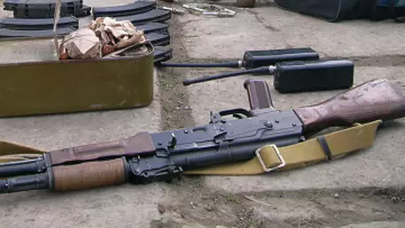 Сотрудники милиции обнаружили в лесу тайник, из которого изъяли две гранаты и пулемет Калашникова. При дальнейшем обследовании территории прогремел взрыв. Раненный инспектор госпитализирован.