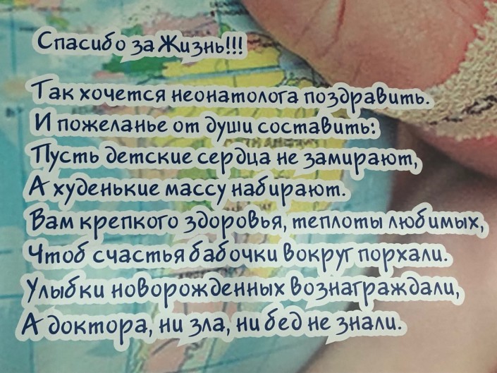 "Мамы часто приходят к нам с уже окрепшими детками, не забывают ни докторов, ни младший медперсонал, благодарят искренне, от всей души. Был случай: двойня, очень сложная, недоношенные. Одна 890 граммов, другая 1 100, очень тяжелые, долго находились на аппарате ИВЛ, им неоднократно проводилось переливание плазмы... Действительно очень тяжелые. Но все-таки мы их выходили, мама была очень благодарна. Где-то через полгода или год она пришла в отделение и принесла две метровые куклы, которые символизировали ее девочек. А дочки ее сейчас уже ходят в школу.