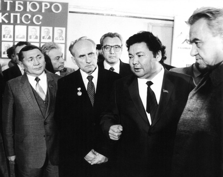 Секретарь ЦК Какимжан Казыбаев и министр образования Нарибаев во время посещения Первым секретарем ЦК КПК Д.А. Кунаевым КазГУ. 1983 год