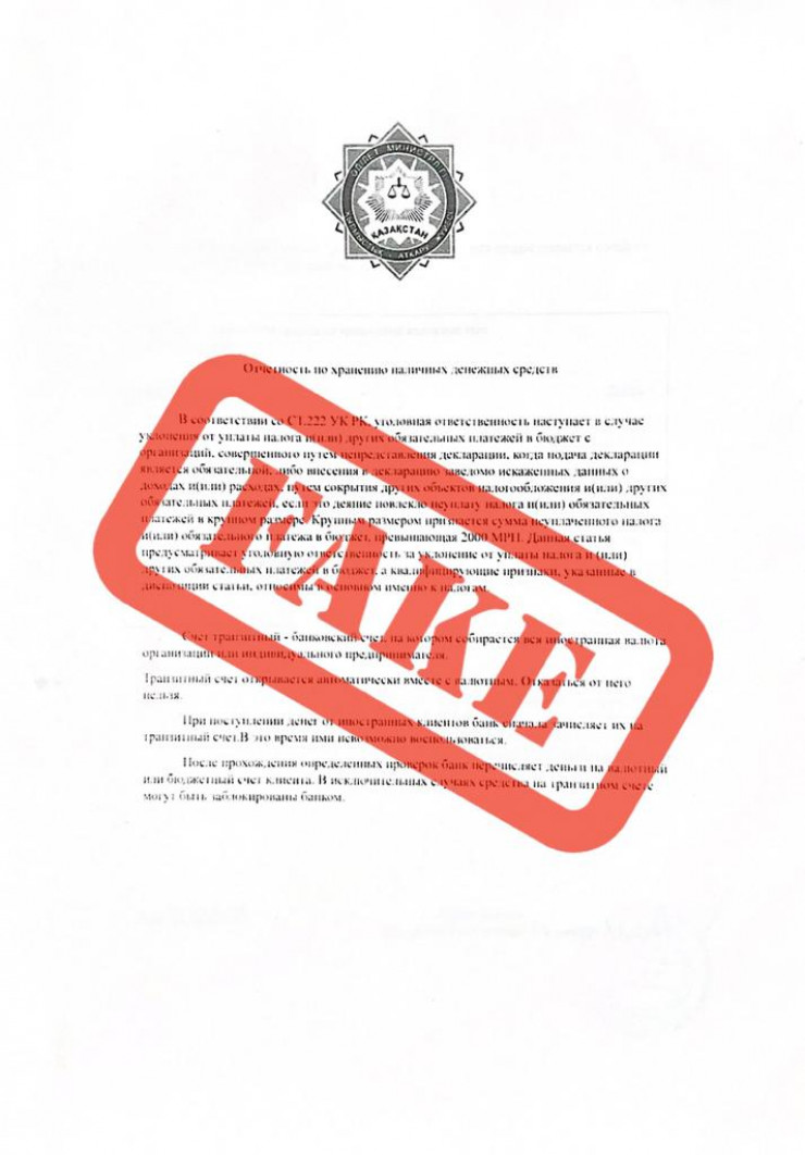 "Министерство юстиции официально заявляет о том, что в социальных сетях мошенниками распространяется недостоверная информация об отчетности по хранению наличных денежных средств с устаревшей эмблемой Министерства юстиции. В документе подпись вице-министра юстиции Алмы Мукановой не соответствует действительности", - предупредили в ведомстве.