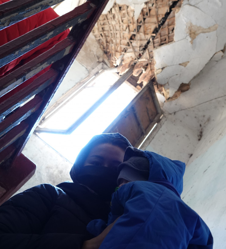 Вот так здание выглядит внутри. Потолок осыпается, и действительно кажется, что вот-вот рухнет.