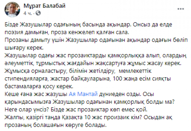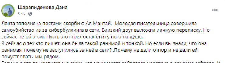 29 июля умерла молодая казахстанская писательница Аягуль Мантай. Информацию о смерти девушки подтвердили в Департаменте полиции Туркестанской области, заведено дело по статье "Доведение до самоубийства", передает корреспондент Tengrinews.kz.