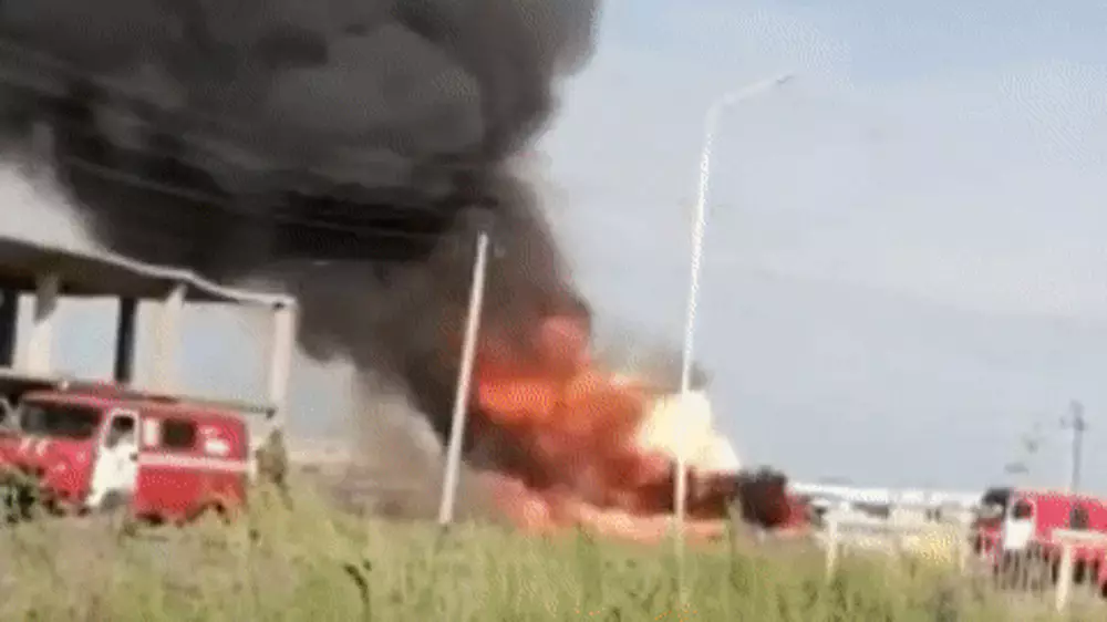 "Утром 5 июня 2020 года в городе Атырау по улице Атамбаева, 5А на территории ТОО "ПромГаз" во время слива газовоздушной смеси произошла утечка газа, а также взрыв с последующим возгоранием кабины автоцистерны марки "Форд". При взрыве было разрушено рядом стоящее здание в 60-70 метрах. На вызов выехали 25 сотрудников и 4 единицы техники ДЧС Атырауской области", - уточнили в пресс-службе.