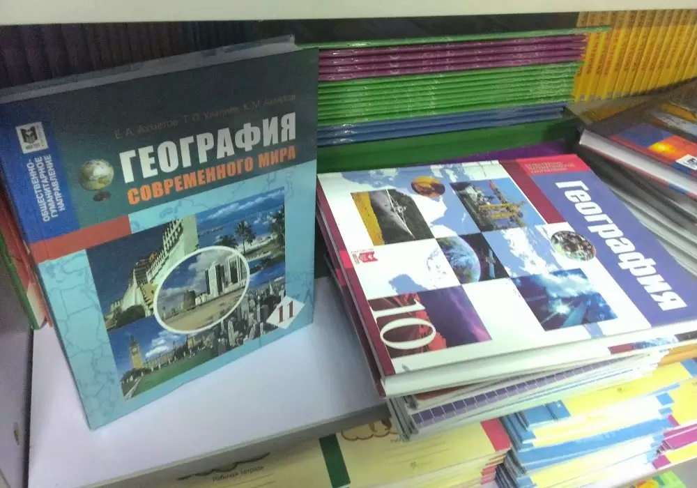 В магазинах Астаны мы без труда обнаружили книги, которые вызвали столь резкую реакцию украинских дипломатов: учебник географии для 10 классов естественно-математического направления общеобразовательных школ издательства "Мектеп" за 2014 год и учебник "География современного мира" для 11 классов общественно-гуманитарного направления общеобразовательных школ за 2015 год (того же издательства).