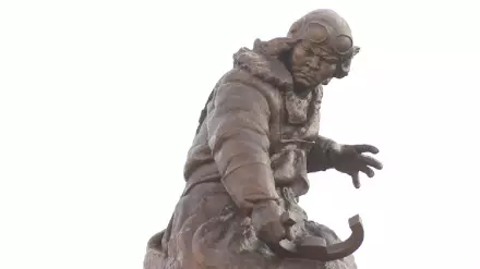 Изначально памятник был отлит из чугуна. Он стал одним из символов Караганды и стоял на одноименной улице с 1958 года. Несколько лет назад неожиданно отвалилась часть штурвала в руках у легендарного летчика. Памятник обследовали специалисты и выдали неутешительный результат: монумент покрылся глубокими трещинами, заделать которые невозможно. За 60 лет чугун стал разрушаться от карагандинских перепадов температур. Власти города решили сделать бронзовую копию памятника.