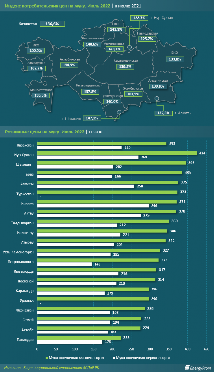 В июле этого года цены на муку выросли на 36,6 процента за год. Стоимость килограмма муки первого сорта составила 225 тенге, высшего сорта - 343 тенге.