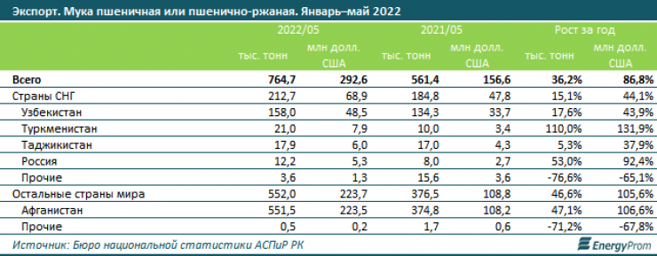 В страны СНГ было отправлено 212,7 тысячи тонн муки - на 15,1 процента больше, чем годом ранее. Больше всего казахстанской муки отправили в Узбекистан: 158 тысячи тонн - на 17,6 процента больше, чем за январь – май 2021-го. В тройку лидеров также попали Туркменистан и Таджикистан.