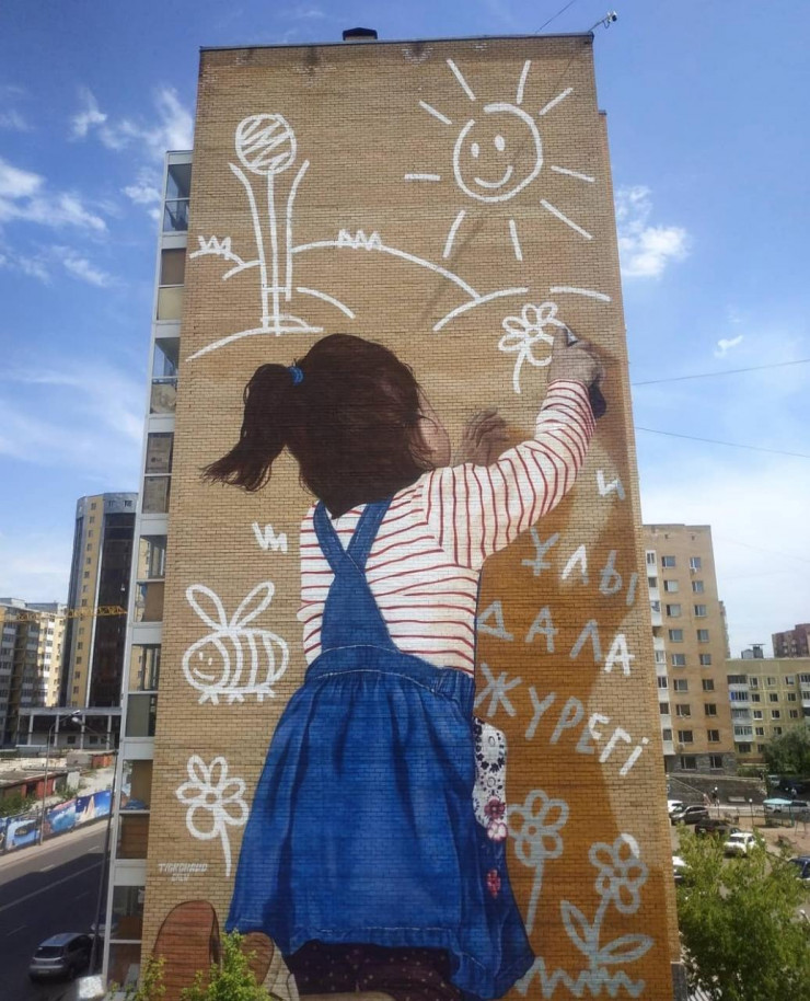 Вместе с автором работали Али Закир, Ержан Танаев, которые переносили работу на стену жилого дома.