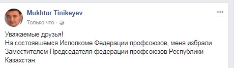 "Уважаемые друзья! На состоявшемся Исполкоме Федерации профсоюзов, меня избрали Заместителем Председателя федерации профсоюзов Республики Казахстан", - написал Мухтар Тиникеев.