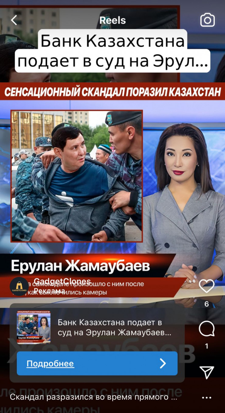 Также в Сети распространяется еще один снимок с Еруланом Жамаубаевым, но уже со ссылкой на сторонний сайт. Его дизайн скопирован с портала Tengrinews.kz. Переходя по ссылке, можно попасть на некую статью с заголовком о том, что на министра подал в суд некий "Банк Казахстана". В тексте полностью выдуманного интервью рекламируется бот для торговли на криптовалютном рынке. Оригинальную запись этой передачи можно найти на YouTube. Ничего, что изложено в статье, на самом деле во время прямого эфира не происходило. Подробнее об этом можете прочитать здесь.