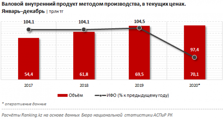 В 2019 году ВВП составлял 69,5 триллиона тенге, годовой рост - на 4,5 процента.