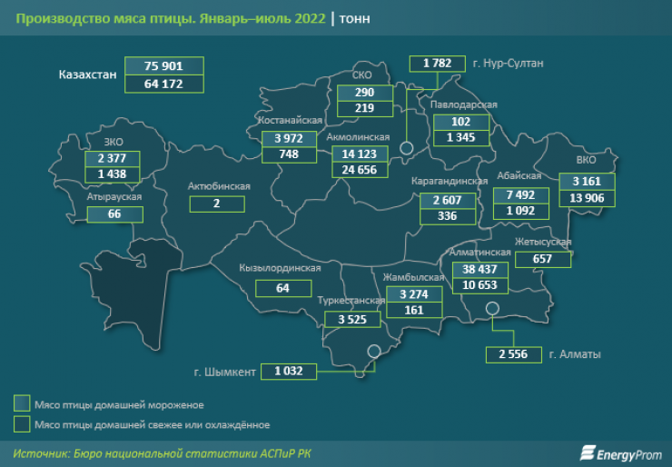 Большая часть производства пришлась на Алматинскую и Акмолинскую области. В Акмолинской области произвели 38,4 процента свежего или охлажденного и 18,6 процента мороженого мяса птицы, в Алматинской - 16,6 процента свежего или охлажденного и 50,6 процента мороженого мяса птицы.