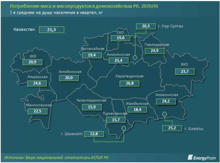 Наибольший рост потребления мяса в третьем квартале 2020-го наблюдается в Карагандинской области (плюс 3,3 килограмма), Нур-Султане (плюс 2,7 килограмма) и Жамбылской области (плюс 2,3 килограмма).