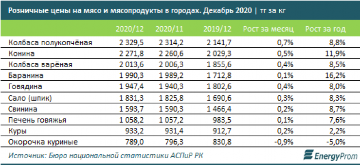 С ростом потребления мяса в стране существенно выросли и цены. Так, розничные цены увеличились на все виды мяса и мясопродуктов. Исключение составили куриные окорочка, чья стоимость уменьшилась за год на 5 процентов до 789 тенге за килограмм.