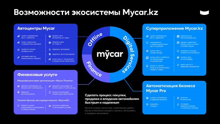 Все продукты бренда доступны онлайн через приложение Mycar.kz, в котором можно выбрать автомобиль в официальном автоцентре или на рынке, среди объявлений от физических лиц, записаться на сервисное обслуживание и продать авто через классифайд (онлайн-витрина объявлений), а также получить предварительное одобрение на автокредитование благодаря платформе Mycredit.
