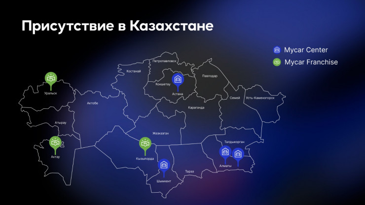 Сегодня в Казахстане успешно функционируют шесть автоцентров Mycar.kz (два в Алматы и по одному автоцентру в городах Астана, Шымкент, и по франшизе в городах Уральск и Актау).