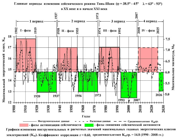 "Эта периодичность сказывается и на местной, тянь-шаньской периодичности. На рисунке показаны главные периоды проявления сейсмичности на Тянь-Шане в двадцатом веке и начале двадцать первого века, по данным покойного Э.М. Мамырова, доктора наук, профессора, ученого, который много лет проработал в Институте сейсмологии НАН КР", - написал сейсмолог.