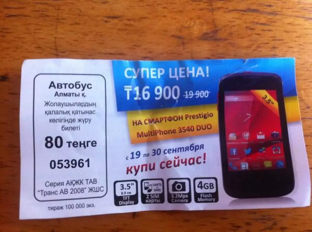 По словам Выприцкого, реклама появилась на билетах в рамках акции одного из казахстанских магазинов электроники. Акция действует в автобусах № 71, 56, 17. "Я знаю, что эксперимент уже был проведен в Астане. Нам предложили использовать такие билеты. Всего мы используем 10 тысяч билетов с рекламой примерно три дня. Денег они нам не перечисляли, но мы имеем экономию, потому что мы не заказываем и не оплачиваем билеты", - объяснил Выприцкий.