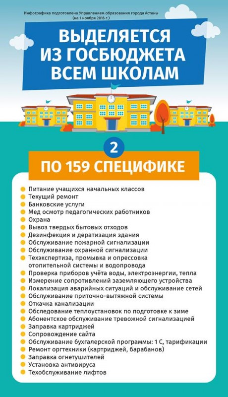 "Уважаемые родители! Ниже представлен список вещей и перечень услуг в школах, на которые выделяются денежные средства из государственного бюджета. Также прикрепляю копию приказа о запрете незаконного сбора денежных средств с родителей", - написала в Facebook пресс-секретарь Управления образования Астаны Жазира Асанова.