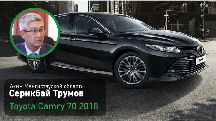 Аким Мангистауской области Серикбай Трумов (на этой должности с 13 июня 2019 года) передвигается на служебном автомобиле марки Toyota Camry 70 черного цвета 2018 года.