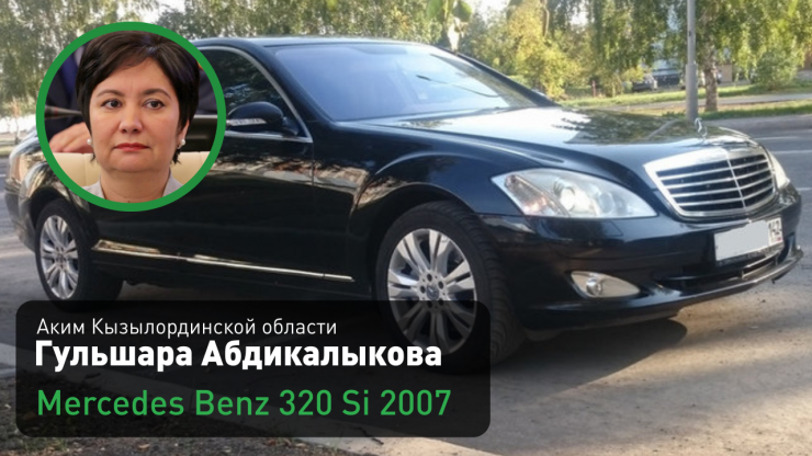 Аким Кызылординской области Гульшара Абдикалыкова (на этой должности с марта 2020 года) использует два служебных автомобиля. Первый - Mercedes-Benz 320 Si черного цвета 2007 года выпуска.