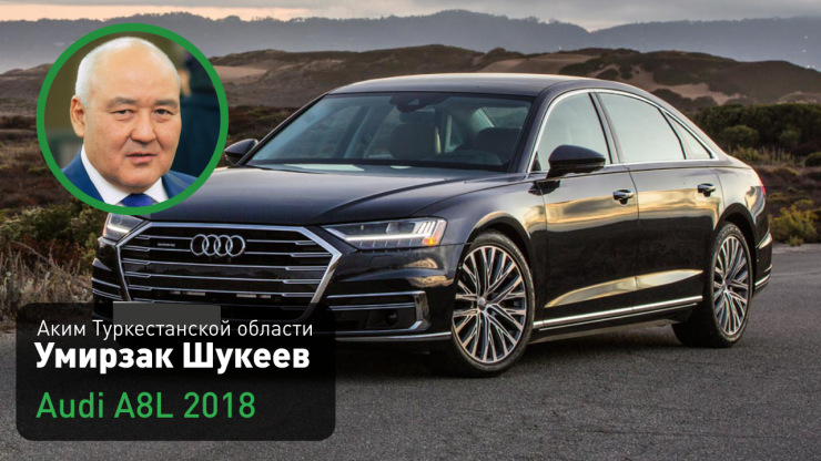 Аким Туркестанской области Умирзак Шукеев (на этой должности с 26 февраля 2019 года) ездит на служебном автомобиле Audi А8 L 2018 года. Цвет - черный металлик.