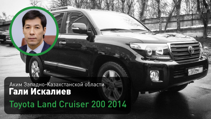 Аким Западно-Казахстанской области Гали Искалиев (на этой должности с июня 2019 года) передвигается на служебном автомобиле Toyota Land Cruiser 200 2014 года выпуска черного цвета.