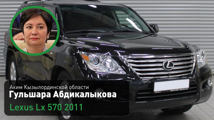 А при командировках в отдаленные населенные пункты, как отметили в самом акимате, учитывая состояние автомобильных дорог (в отдельных случаях бездорожье), Гульшара Абдикалыкова использует служебный автомобиль марки Lexus LХ 570 черного цвета 2011 года выпуска.