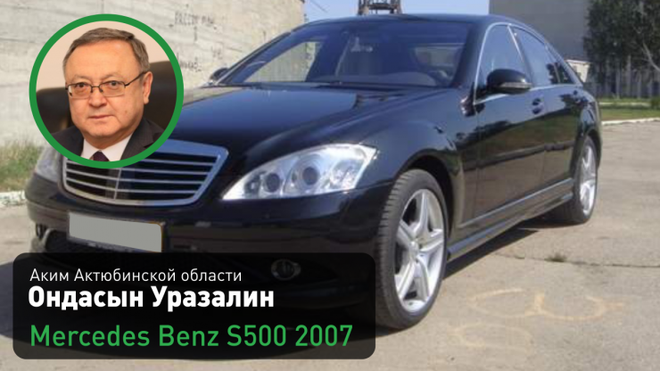 Аким Актюбинской области Ондасын Уразалин (на этой должности с 26 февраля 2019 года) ездит на служебном автомобиле Mercedes-Benz S 500 2007 года выпуска, цвет - черный.