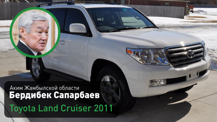 Аким Жамбылской области Бердибек Сапарбаев (на этой должности с 10 февраля 2020 года) ездит на белом Toyota Land Cruiser 2011 года выпуска.