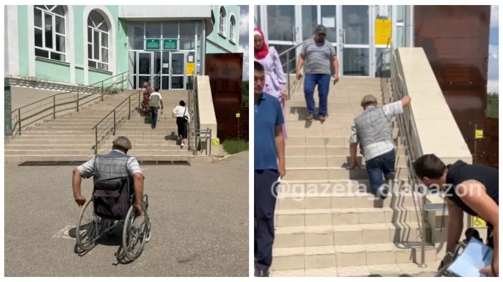"В четвертый раз поднимаюсь я здесь на коленках. Первый раз менял удостоверение год назад, второй - когда карточку менял. Потом справку мне надо было взять. Постоянно у них отговорки: лифт не работает. Причину находят, отговорки находят. Хорошо, что добрые люди мне коляску помогают поднять. Не знаю, что думают. Решил обратиться, может быть, через газету на них повлияет. Я же не один такой. Многие так приезжают и возвращаются", - рассказал изданию актюбинец Вячеслав. У мужчины частично нет обеих ног.