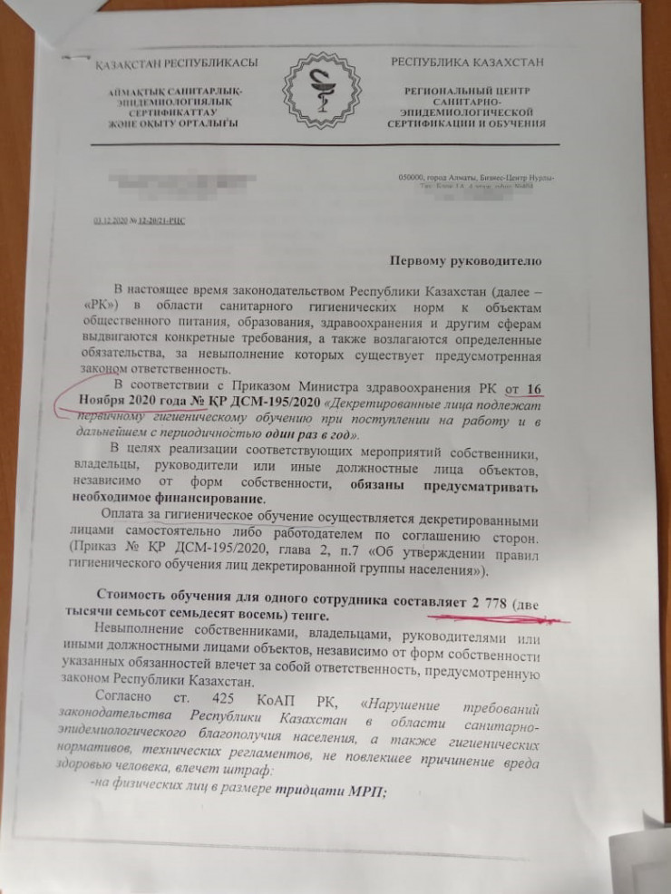 "Это может быть и медорганизация, которая проводит профилактический осмотр, при наличии в штате сотрудника санитарно-гигиенического профиля. Стоимость обучения входит в стоимость проведения медицинского осмотра", - сказала Асель Калыкова.