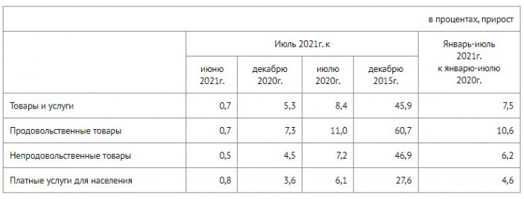 Сообщается, что за июль 2021 года в сравнении с июнем цены на продовольственные товары повысились на 0,7 процента, непродовольственные - на 0,5 процента, платные услуги - на 0,8 процента.
