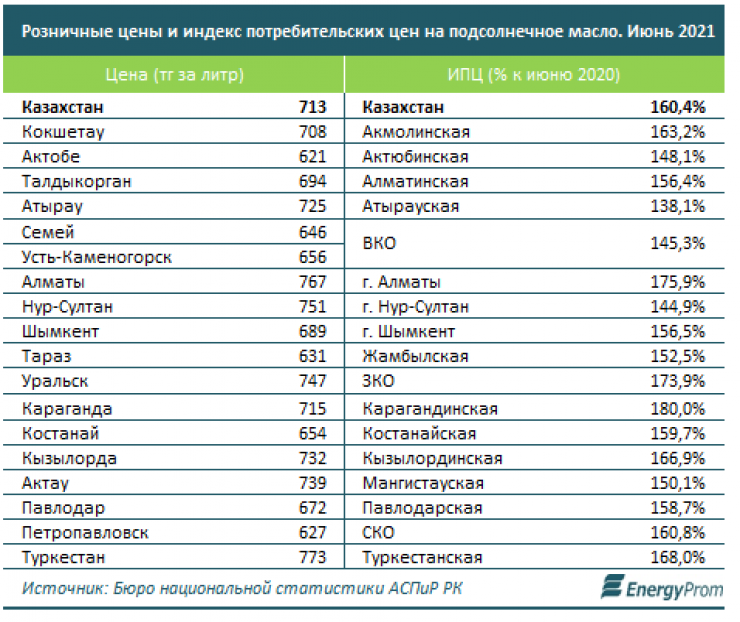 В среднем на рынках и в магазинах страны в июне 2021-го цена масла составила 713 тенге за литр. Дороже всего бутылка масла обходится жителям Туркестана - по 773 тенге за литр.
