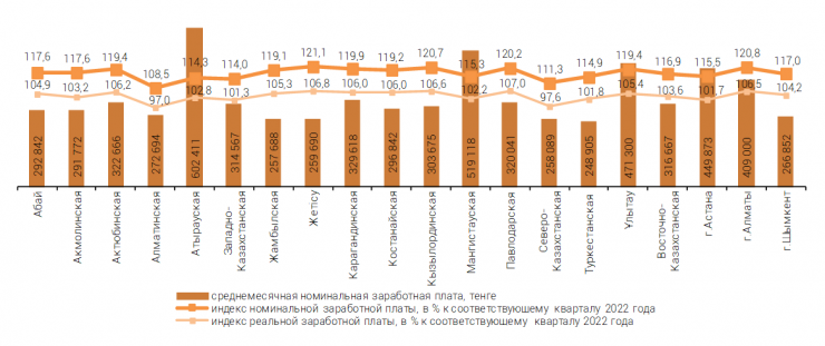 "В региональном разрезе наибольший рост среднемесячной номинальной заработной платы в третьем квартале 2023 года по сравнению с соответствующим кварталом 2022 года сложился в области Жетысу – на 21,1 процента, в Алматы – на 20,8 процента, в Кызылординской области – на 20,7 процента. Самый низкий рост наблюдается в Алматинской области – на 8,5 процента и в Северо-Казахстанской области – на 11,3 процента", - отметили в Бюро нацстатистики.